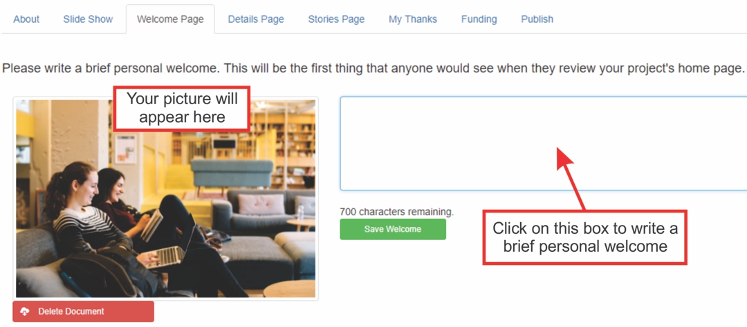 This is the next section a user will see. You can add another picture here as well as a brief welcome.